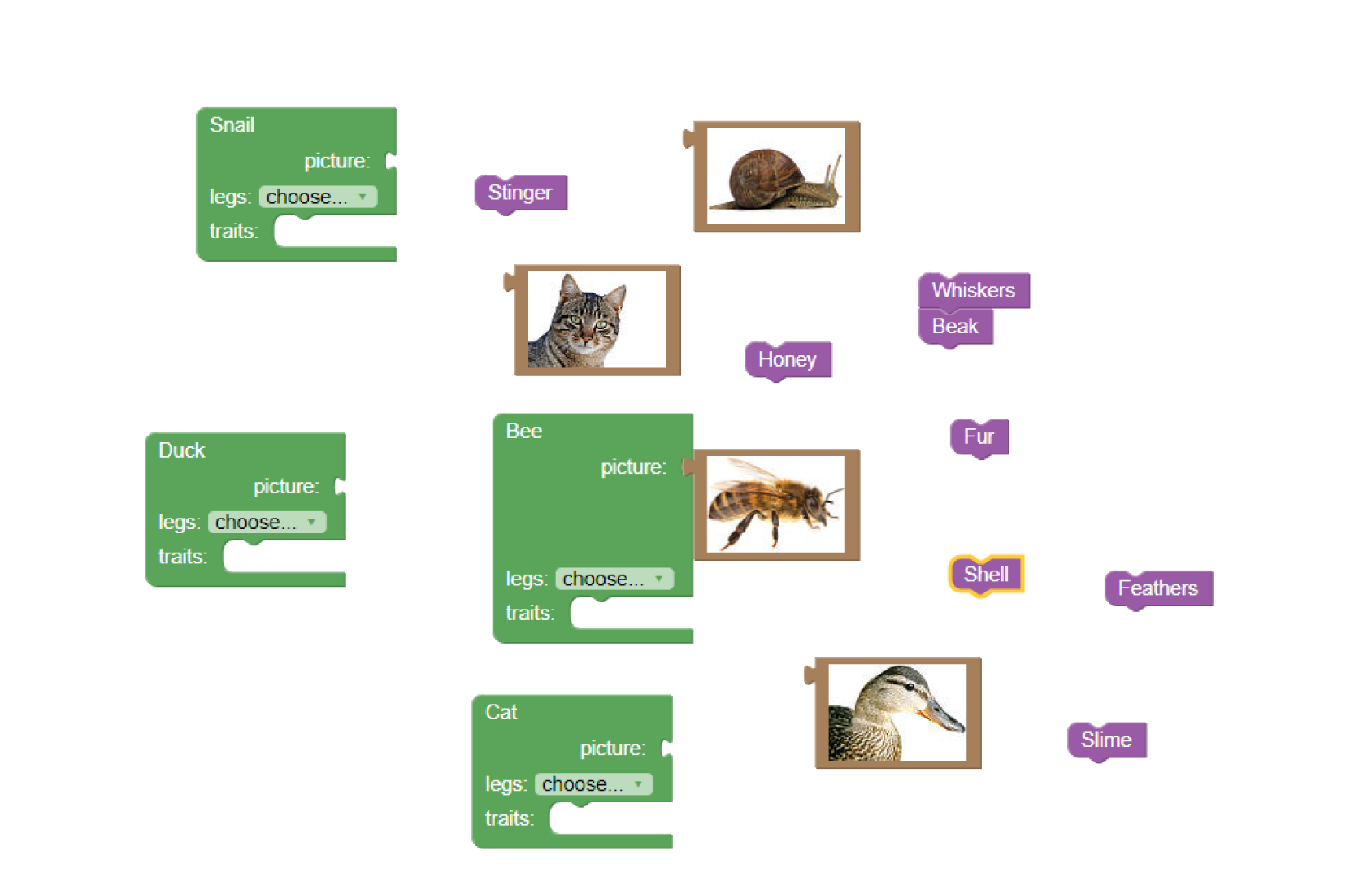 Bij het blok Puzzle moet je bijvoorbeeld de juiste attributen geven aan de juiste manier door middel van het slepen van blokjes.