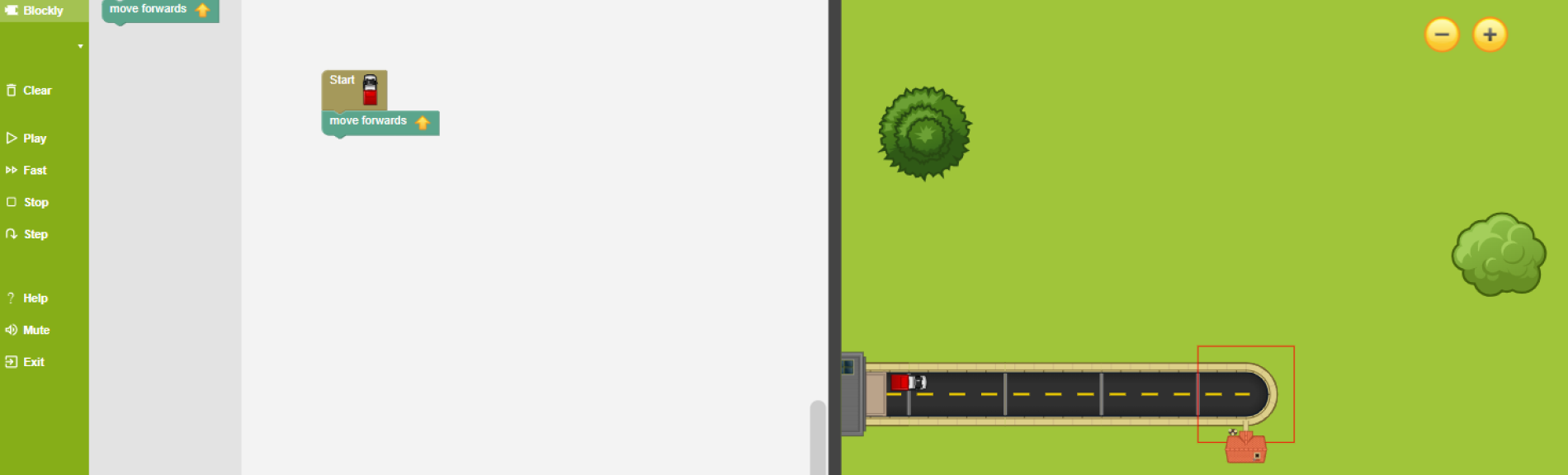 Aan het einde worden er ook loops and if statements geïntroduceerd. De manier waarop het level wordt gehaald maakt niet uit, zolang de auto op de juiste plek uit komt. Het level hieronder had ook gehaald kunnen worden door 5x het blok ‘move forwards’ neer te zetten. Dit zorgt ervoor dat het kind op een eigen manier het level kan halen en een eigen denkwijze kan toepassen. Bij sommige levels wordt ook een nieuw scherm toegevoegd met de code waarin de blokjes worden omgezet in code en zichtbaar zijn voor het kind. Er kan hier niet direct in geschreven worden aangezien het is bedoeld om een kijkje te nemen achter de schremen.