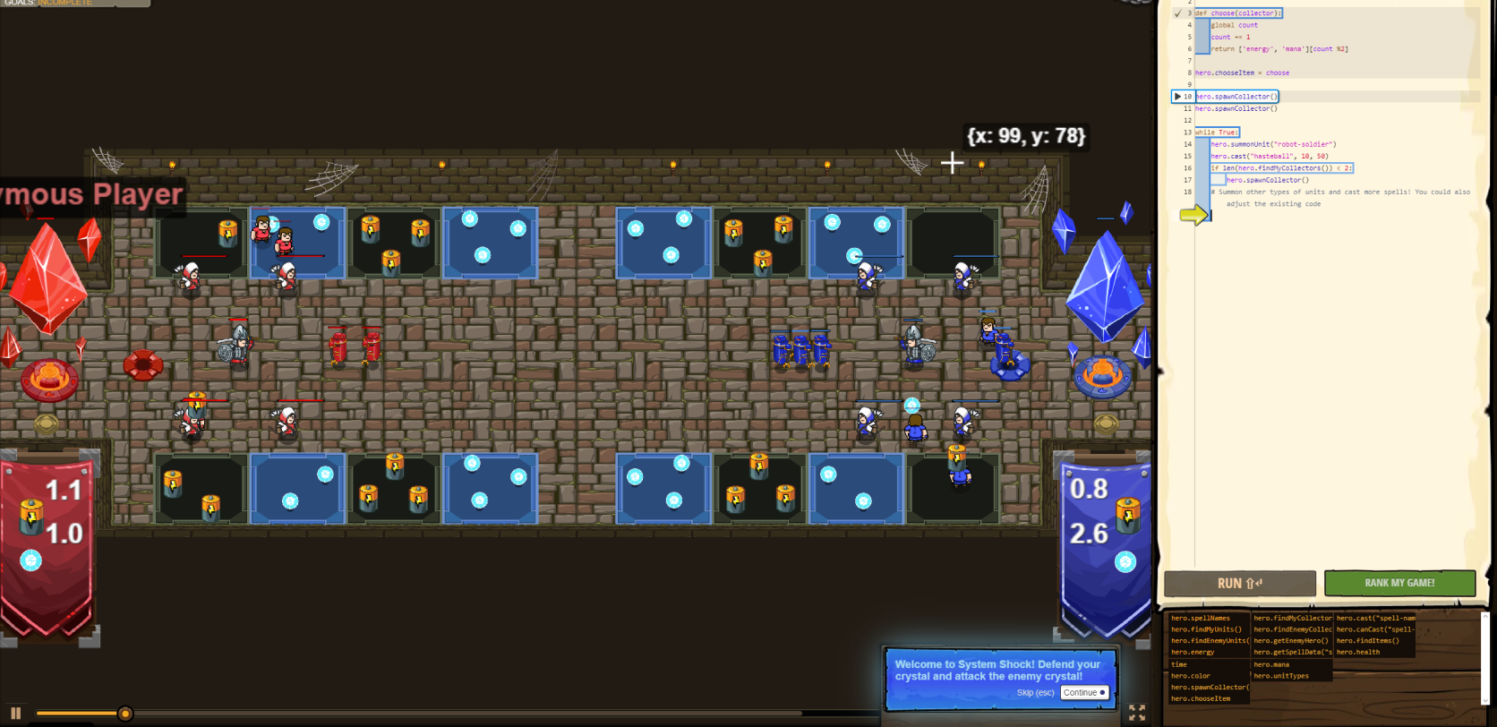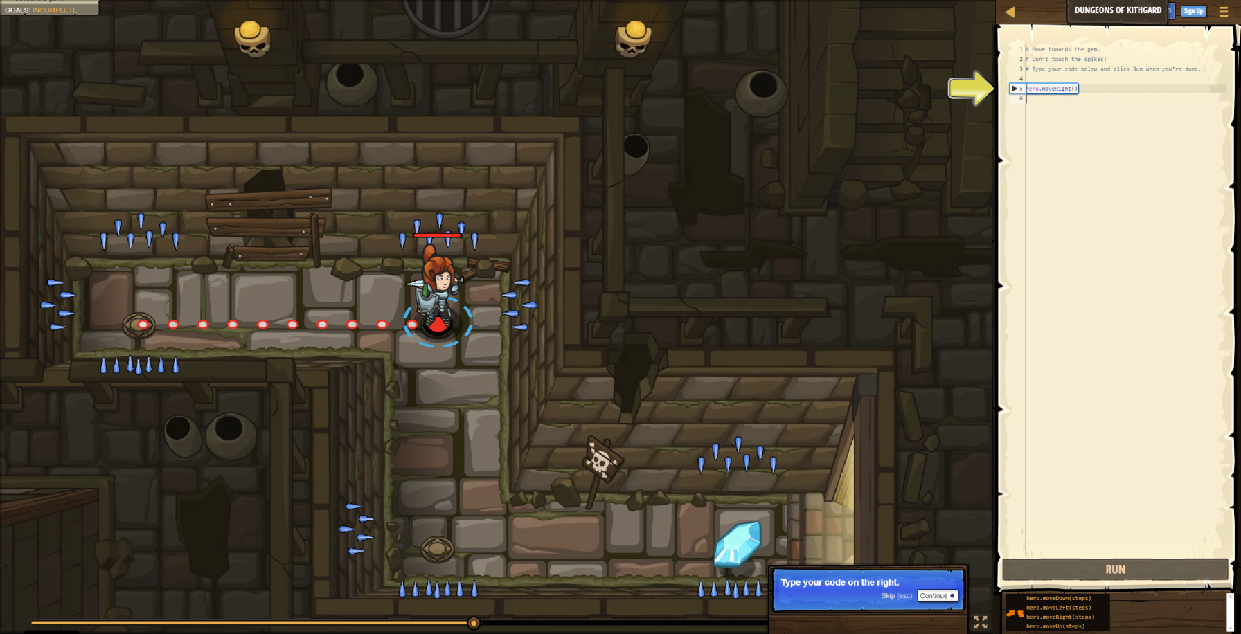 In Code Combat zijn verschillende ‘cursussen’ gemaakt die de kinderen kunnen spelen en elke cursus telt als een onderdeel van deze RPG. De cursus Kithgard Dungeon ziet er bijvoorbeeld op deze manier uit:
