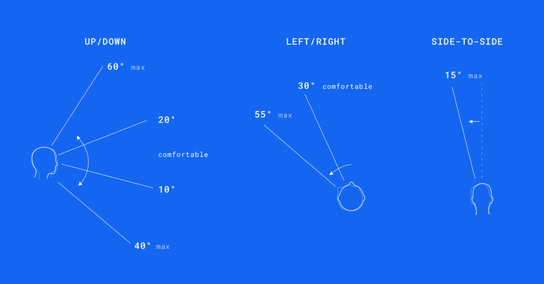 Bij het ontwerpen voor VR is het leuk om te denken aan het creëren van futuristische interfaces. Maar de realiteit is dat deze UIs vermoeiend zouden zijn als ze langer dan een paar minuten worden gebruikt. De volgende diagrammen helpen om de comfortabele bewegingszones te illustreren: