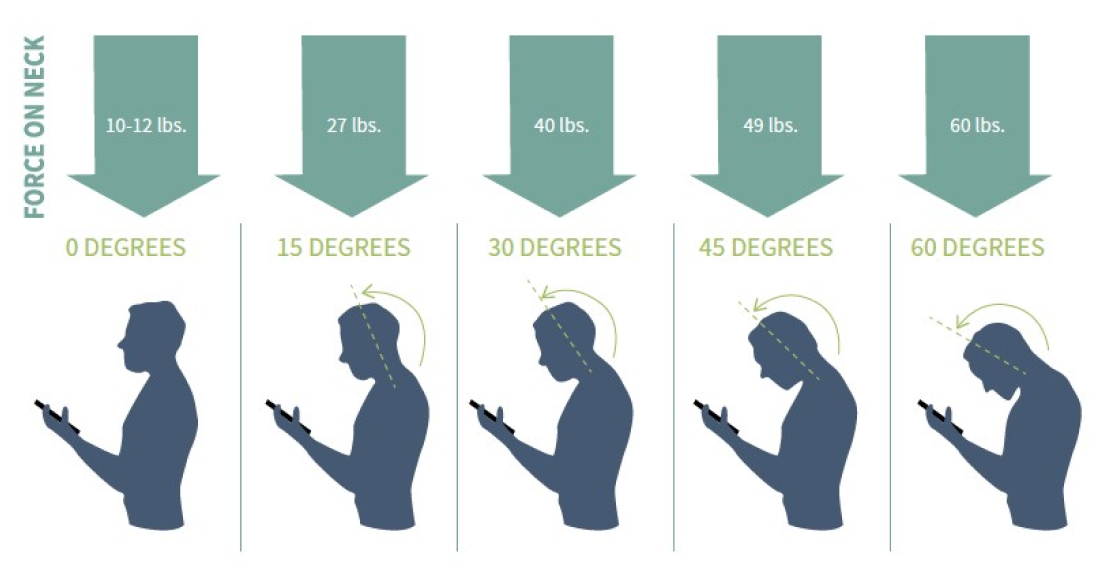 We zijn allemaal wel eens getroffen door een soort “text neck” syndroom (de pijn die wordt gevoeld door lang naar onze smartphones te kijken). Afhankelijk van hoe ver je overleunt, kan een slechte houding tot 30 kg druk op je ruggengraat veroorzaken. Dit kan leiden tot permanente zenuwschade in je ruggengraat en nek.