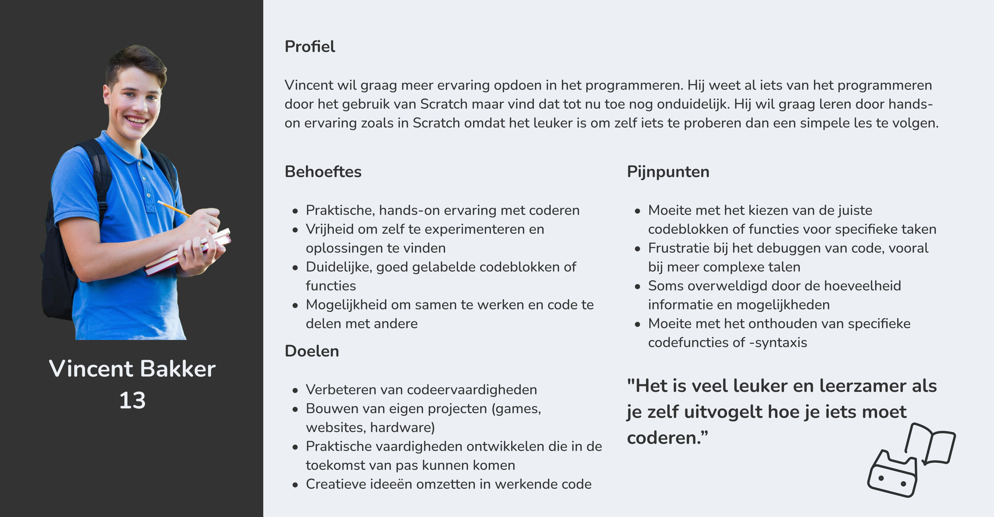 Daarnaast kinderen die al wel ervaring hebben met coderen en beginnen met een beetje voorkennis. Deze kinderen willen graag aan het werk in een omgeving waar ze zelf kunnen bekijken hoe alles werkt en hebben minder behoefte aan gestructureerde lessen.