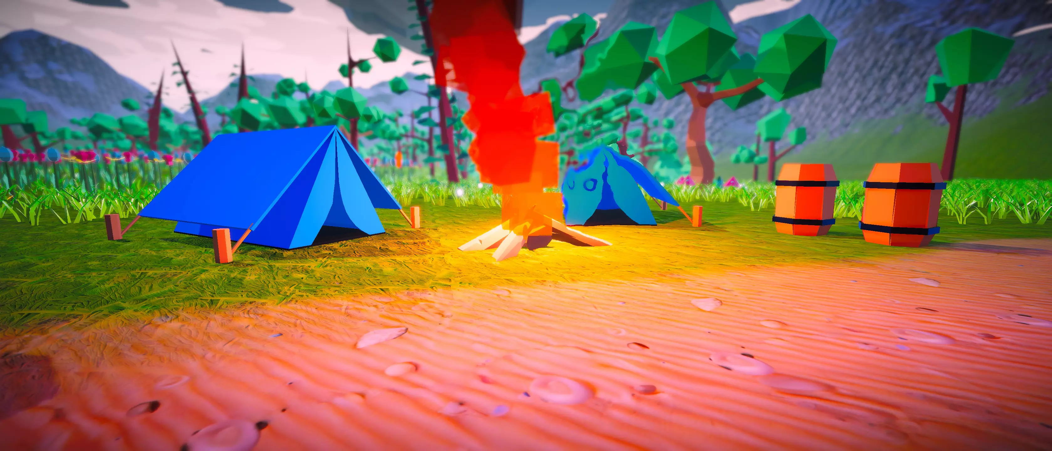 Voor het kampvuur aan het begin van de game ben ik opzoek gegaan naar een gratis low-poly asset die aansloot bij de assets van de rest van de wereld. Ik heb uiteindelijk onderstaande asset pack gekozen omdat ik deze het beste eruit vond zien en het beste aansloot bij mijn andere assets. Asset pack: https://assetstore.unity.com/packages/3d/environments/low-poly-stylized-nature-281338
