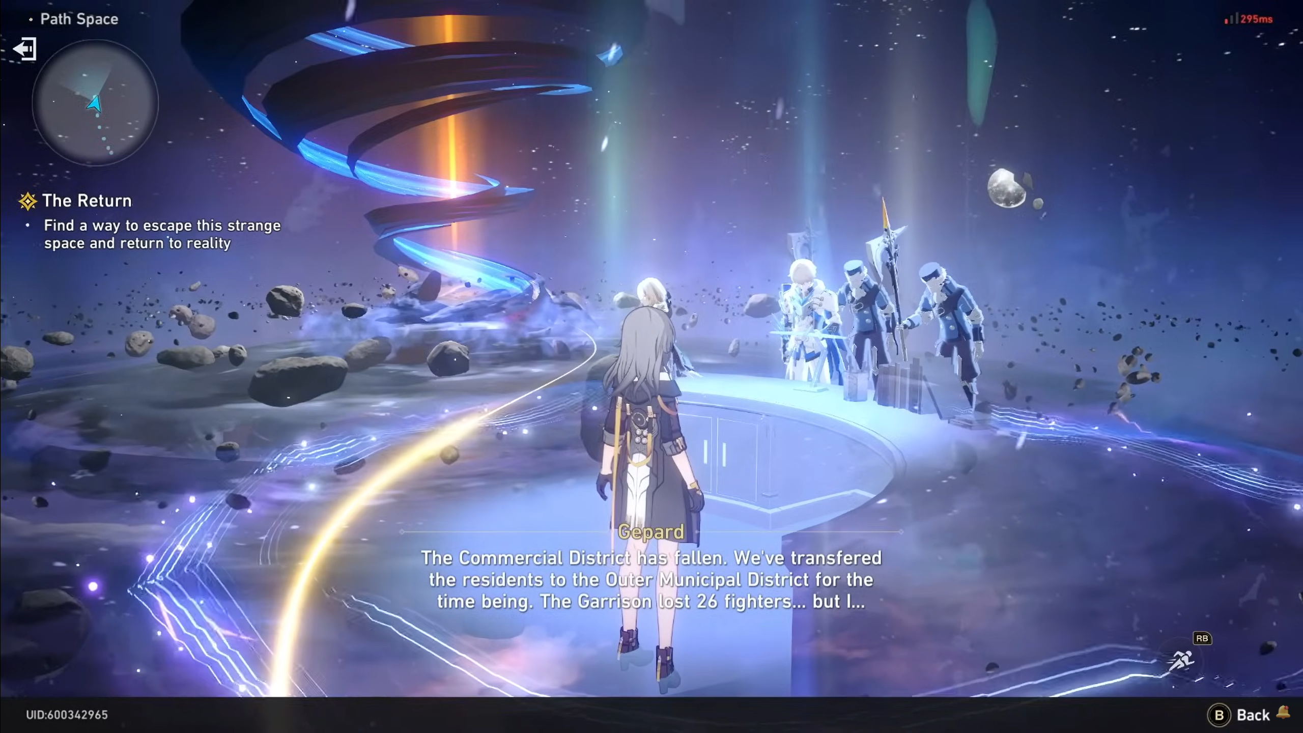 De tweede manier die HSR op sommige momenten gebruikt is de narrative laten zien met behulp van uitgewerkte scene’s uit het verhaal. Wat ik zelf mooi vind aan deze manier is dat je als speler door een soort eindeloze wereld loopt waar wel een einddoel zichtbaar is. Je volgt een soort pad dat wordt aangegeven met behulp van een gele lijn. Op sommige plekken staan er langs dit pad uitgewerkte scene’s van het verhaal zoals in onderstaande afbeeldingen zichtbaar is. Deze scene’s worden zichtbaar als je dichtbij komt en verdwijnen ook weer als je verder loopt. Dit geeft echt het gevoel dat je door het verhaal heen loopt.